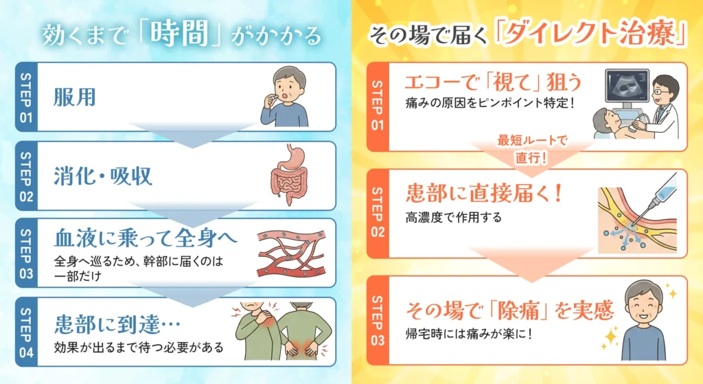 飲み薬は、消化・吸収され全身を巡ってから患部に届くため、効果が出るまでに時間がかかります。対して、当クリニックのエコーガイド下ブロック注射は、原因部位に高濃度の薬剤を「ダイレクト」に届けます。そのため、「打ったその場で」痛みがスーッと消えていく即効性を、多くの患者様が実感されています。