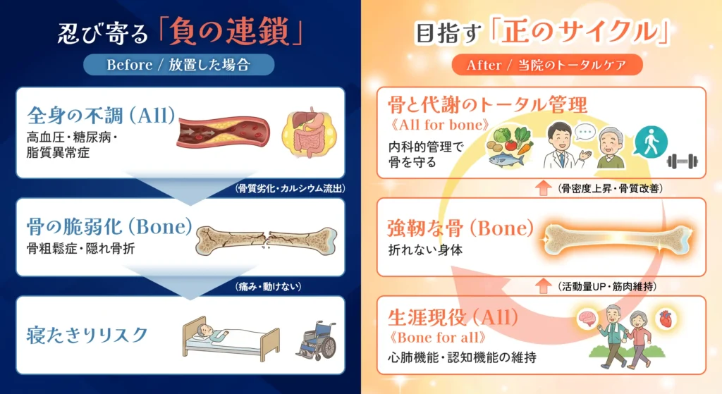 「骨粗しょう症」と「生活習慣病(糖尿病・高血圧・脂質異常症)」は、実は密接につながっています。生活習慣の乱れは骨の質を劣化させ、知らないうちに骨折のリスクを高めてしまいます。私たちは「骨だけ」「数値だけ」を診るのではなく、あなたの身体全体をトータルで管理し、真の健康づくりに取り組みます。