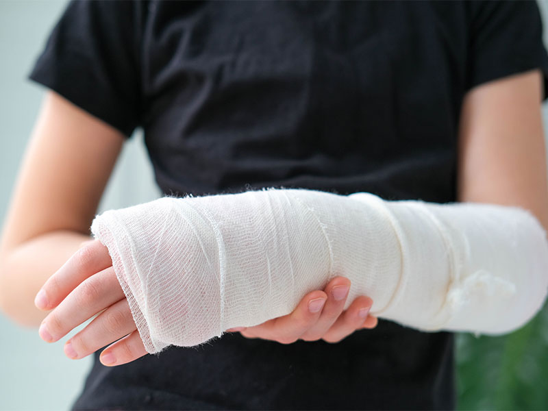 骨折は、骨が完全に折れる場合だけでなく、ひびが入る、押しつぶされるように陥没する状態も含まれます。多くは転倒や衝突など強い力が加わることで起こりますが、スポーツでの負荷の蓄積による疲労骨折、骨粗しょう症などが背景にある病的骨折も見られます。主な症状は腫れや強い痛みで、重度になると変形したり、通常では考えられない方向に動いてしまうこともあります。治療はまず折れた骨を正しい位置に整え、その後しっかり固定することが基本です。ギプスや副木による外固定のほか、必要に応じて手術で金属を用いて固定することもあります。